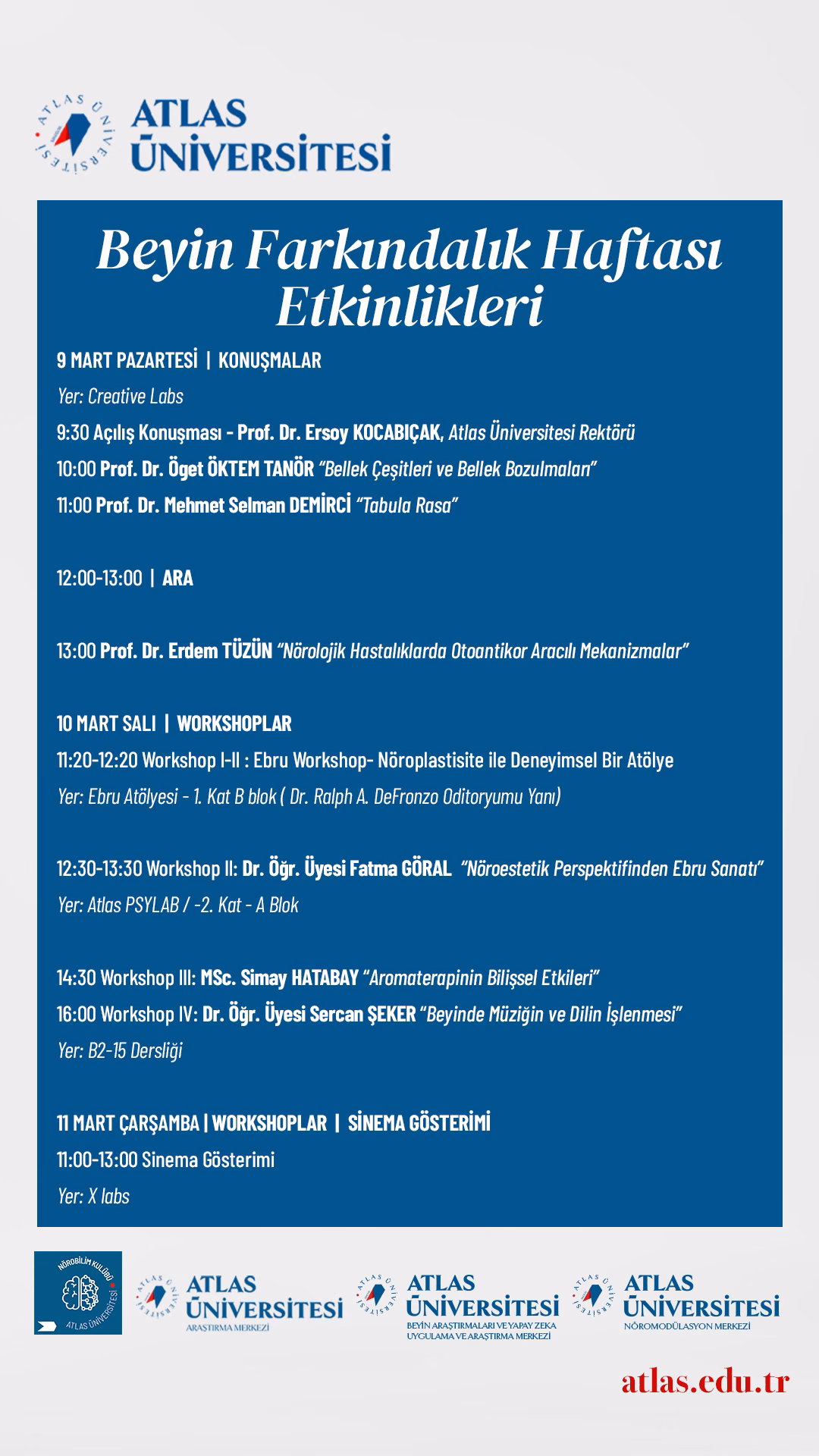 Bu kapsamda, 9–11 Mart tarihleri arasında Üniversitemiz tarafından düzenlenen Beyin Farkındalık Haftası, Atlas Vadi Kampüs’te gerçekleştirilecek etkinliklerle kutlanacaktır. Program süresince; alanında uzman akademisyenlerin katılımıyla bilimsel konuşmalar, nörobilim temelli deneyimsel atölye çalışmaları ve sinema gösterimi yer alacaktır.