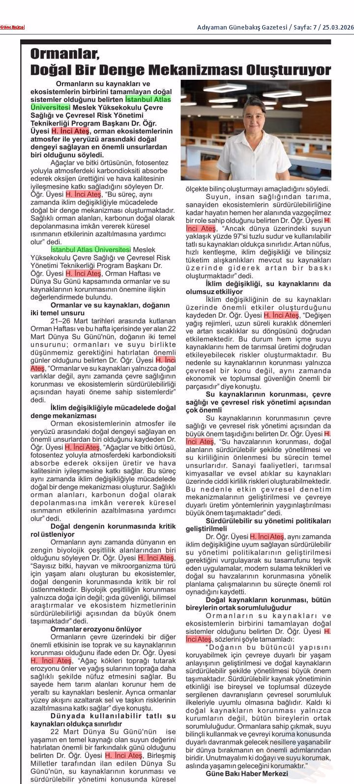 İstanbul Atlas Üniversitesi Meslek Yüksekokulu Çevre Sağlığı ve Çevresel Risk Yönetimi Teknikerliği Program Başkanı Dr. Öğr. Üyesi H. İnci Ateş, Orman Haftası ve Dünya Su Günü kapsamında ormanlar ve su kaynaklarının korunmasının önemine ilişkin değerlendirmede bulundu.