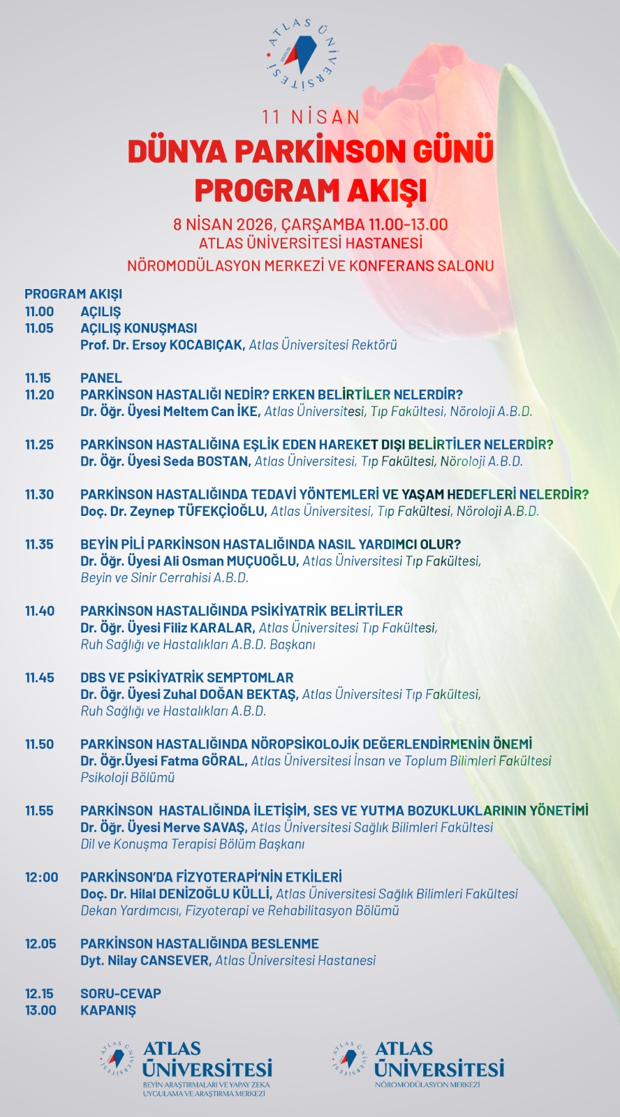 Üniversitemiz tarafından düzenlenen "Dünya Parkinson Günü: Parkinson Tedavisinde Multidisipliner Yaklaşımlar Paneli" etkinliği, 8 Nisan 2026 tarihinde saat 11.00'de, Atlas Üniversitesi Hastanesi Nöromodülasyon Merkezi ve Konferans Salonu'nda gerçekleştirilecektir.