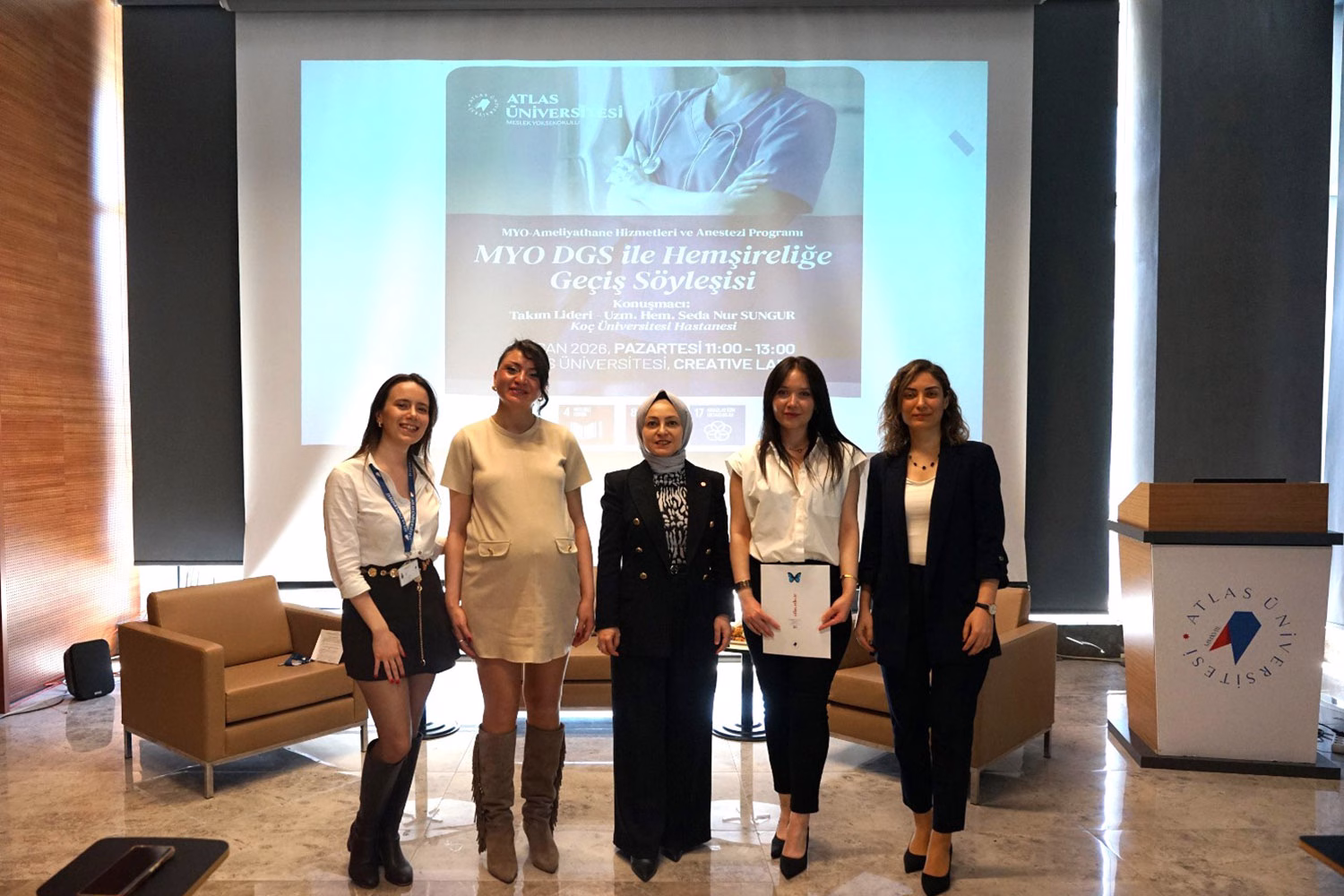 Etkinlikte, Meslek Yüksekokulu Ameliyathane Hizmetleri ve Anestezi Programlarından Dikey Geçiş Sınavı (DGS) ile Hemşirelik bölümüne yerleşen ve başarıyla mezun olan konuşmacı Koç Üniversitesi Hastanesi bünyesinden Uzm. Hem. Seda Nur Sungur, kendi deneyimlerini öğrencilerimizle paylaştı. Söyleşi kapsamında; DGS’ye hazırlık ve motivasyon süreci, etkili ders çalışma yöntemleri, kaynak seçimi, zaman yönetimi ve üniversiteye geçiş sürecinde karşılaşılan zorluklar ele alındı.