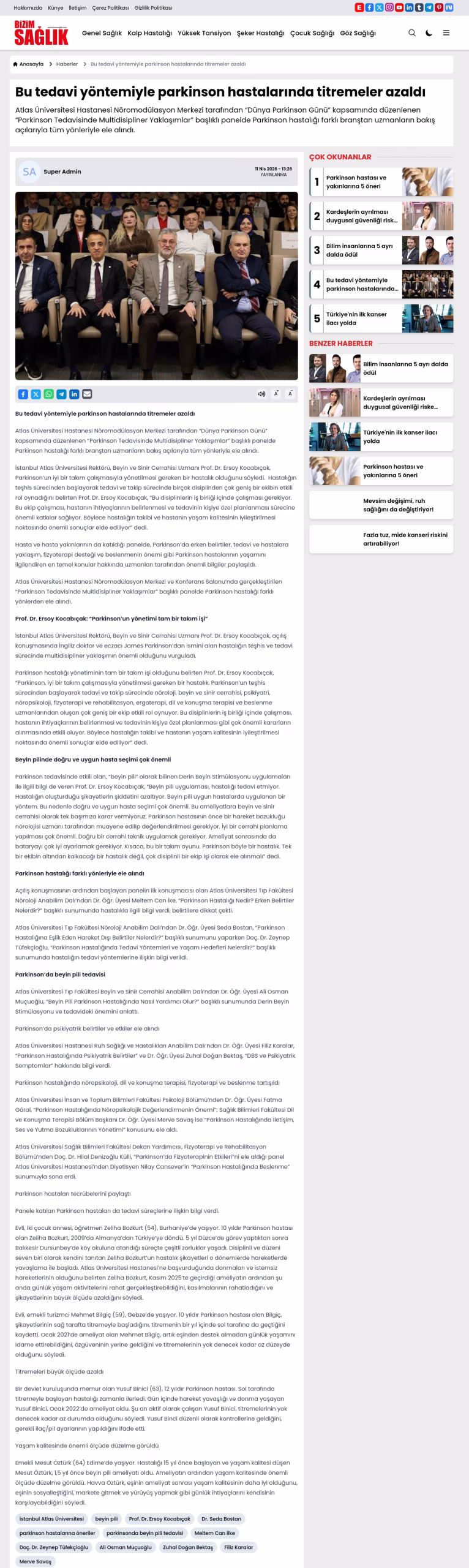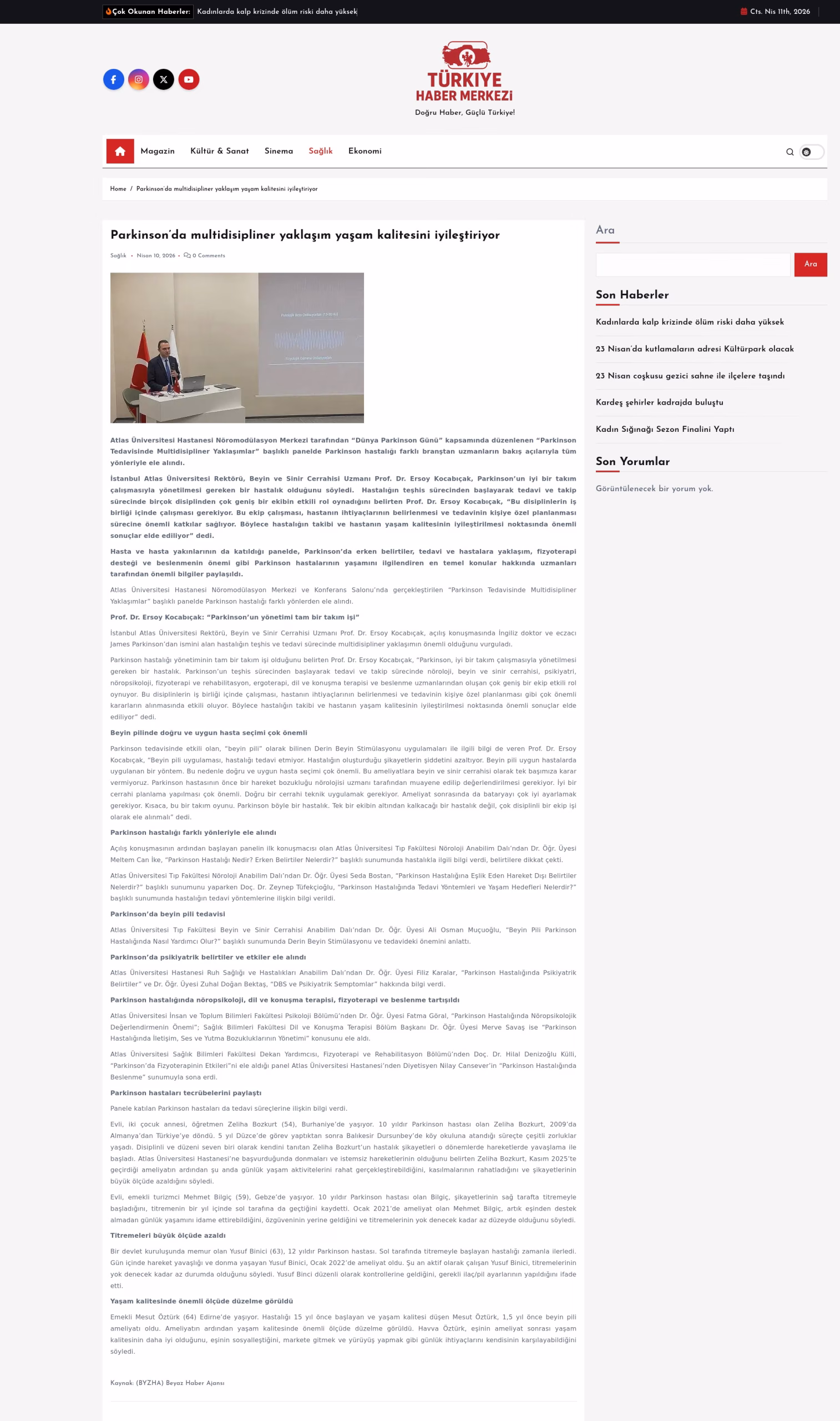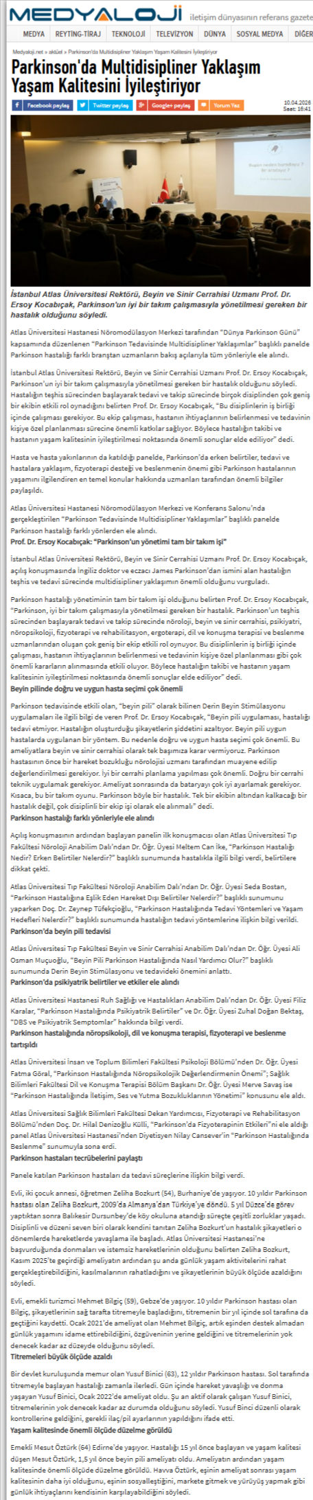 İstanbul Atlas Üniversitesi Rektörü, Beyin ve Sinir Cerrahisi Uzmanı Prof. Dr. Ersoy Kocabıçak, Parkinson’un iyi bir takım çalışmasıyla yönetilmesi gereken bir hastalık olduğunu söyledi. Hastalığın teşhis sürecinden başlayarak tedavi ve takip sürecinde birçok disiplinden çok geniş bir ekibin etkili rol oynadığını belirten Prof. Dr. Ersoy Kocabıçak, “Bu disiplinlerin iş birliği içinde çalışması gerekiyor. Bu ekip çalışması, hastanın ihtiyaçlarının belirlenmesi ve tedavinin kişiye özel planlanması sürecine önemli katkılar sağlıyor. Böylece hastalığın takibi ve hastanın yaşam kalitesinin iyileştirilmesi noktasında önemli sonuçlar elde ediliyor” dedi.