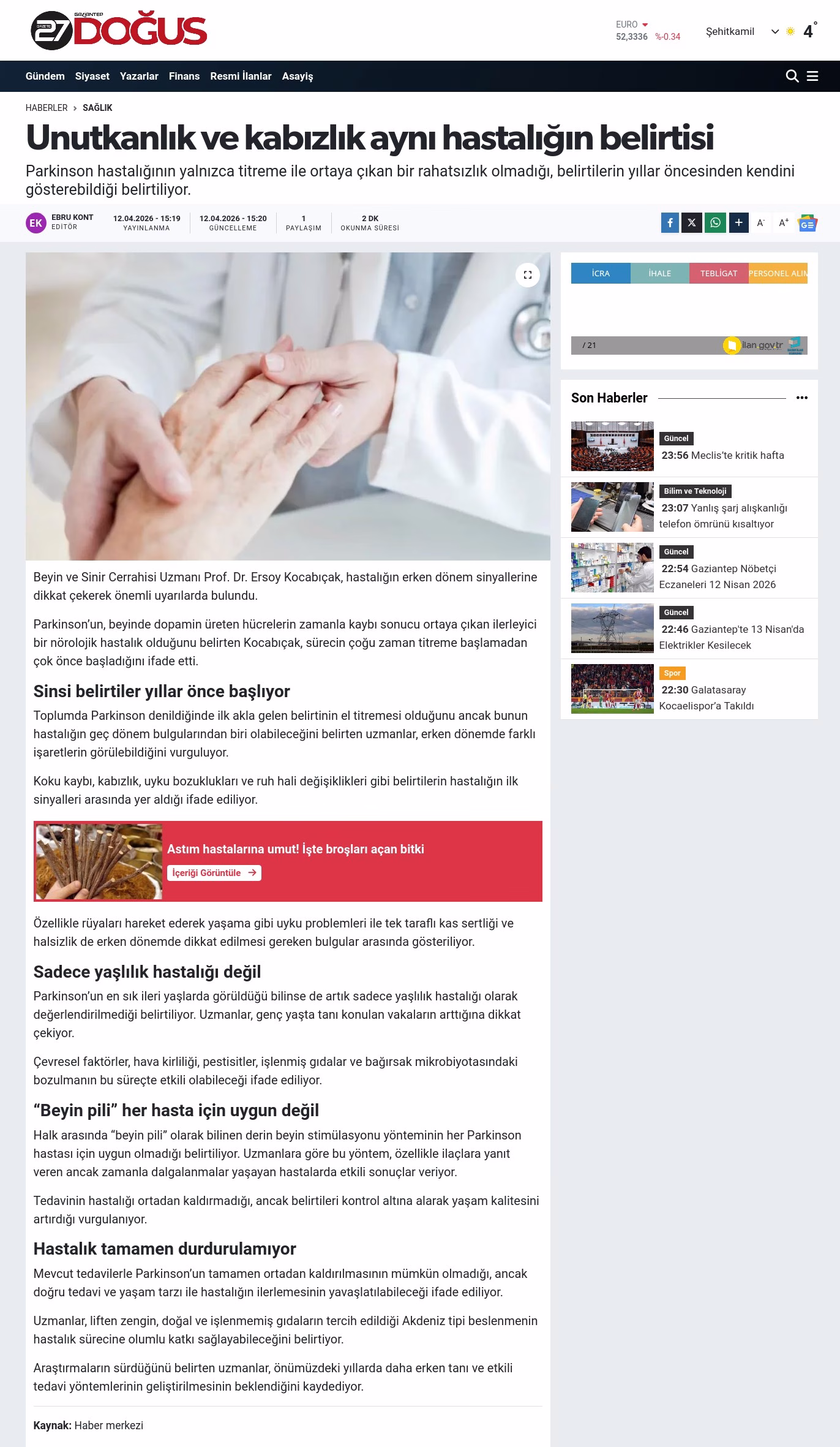 Bir devlet kuruluşunda memur olan Yusuf Binici (63), 12 yıldır Parkinson hastası. Sol tarafında titremeyle başlayan hastalığı zamanla ilerledi. Gün içinde hareket yavaşlığı ve donma yaşayan Yusuf Binici, Ocak 2022’de ameliyat oldu. Şu an aktif olarak çalışan Yusuf Binici, titremelerinin yok denecek kadar az durumda olduğunu söyledi. Yusuf Binci düzenli olarak kontrollerine geldiğini, gerekli ilaç/pil ayarlarının yapıldığını ifade etti.