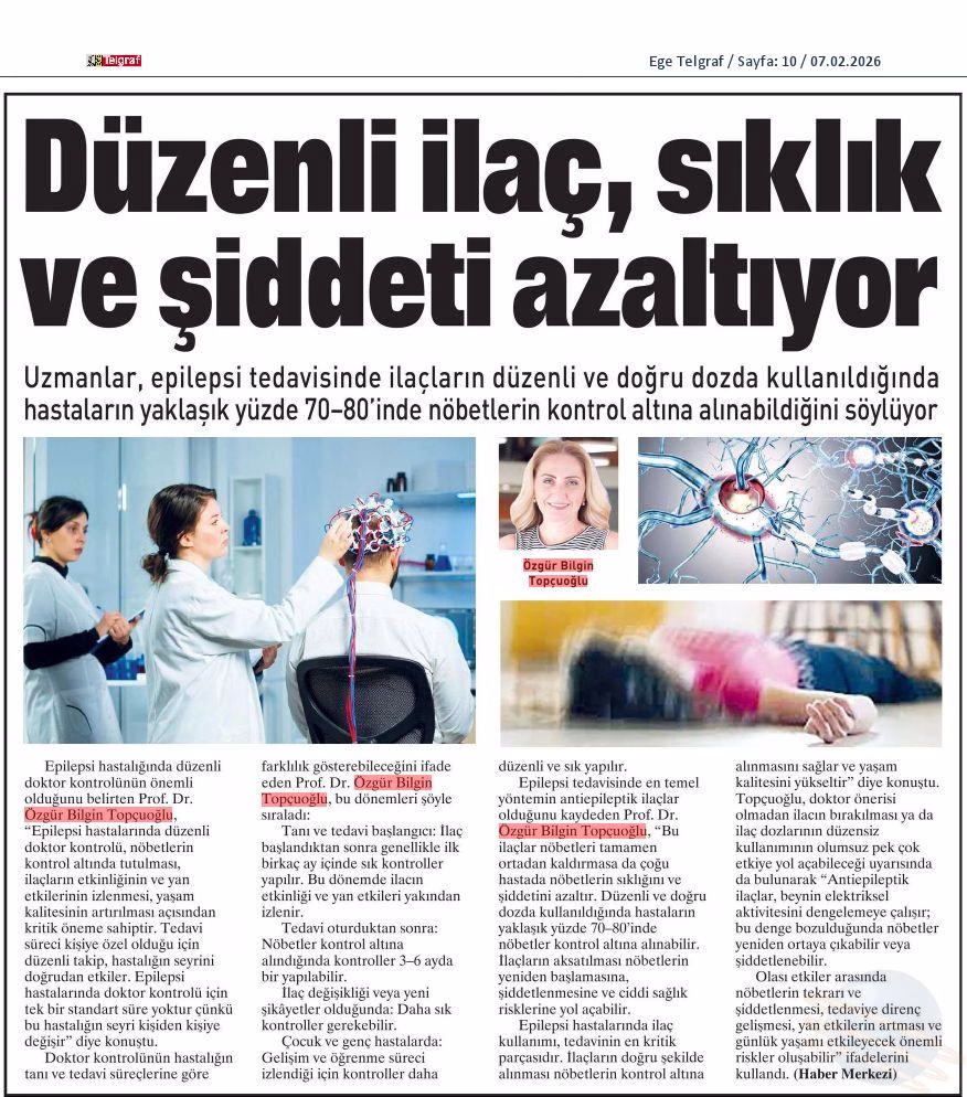 Epilepsi hastalığında düzenli doktor kontrolünün önemli olduğunu belirten Prof. Dr. Özgür Bilgin Topçuoğlu, “Epilepsi hastalarında düzenli doktor kontrolü, nöbetlerin kontrol altında tutulması, ilaçların etkinliğinin ve yan etkilerinin izlenmesi, yaşam kalitesinin artırılması açısından kritik öneme sahiptir. Tedavi süreci kişiye özel olduğu için düzenli takip, hastalığın seyrini doğrudan etkiler. Epilepsi hastalarında doktor kontrolü için tek bir standart süre yoktur çünkü bu hastalığın seyri kişiden kişiye değişir” diye konuştu.