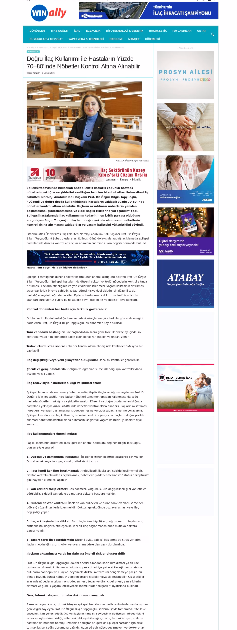 İstanbul Atlas Üniversitesi Tıp Fakültesi Nöroloji Anabilim Dalı Başkanı Prof. Dr. Özgür Bilgin Topçuoğlu, 9 Şubat Uluslararası Epilepsi Günü dolayısıyla yaptığı açıklamada epilepsi hastalarında düzenli kontrol ve ilaç kullanımının önemine ilişkin değerlendirmede bulundu.
